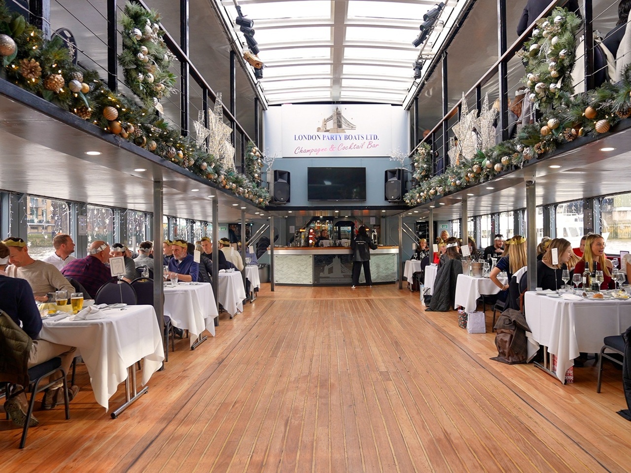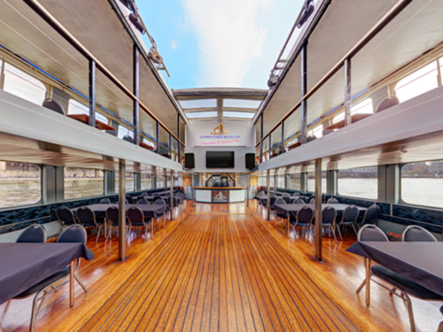 The Jewel of London can accommodate up to 240 passengers across two spacious and fully heated decks. Renowned as a super club on water, it boasts a unique mezzanine-style upper deck that sets it apart from other vessels on the Thames. This unique design facilitates seamless connectivity between the upper and lower decks. The DJ booth, situated on the upper deck, offers an unobstructed view of the dancefloor, complemented by an advanced sound system and lighting that creates an unparalleled party atmosphere.