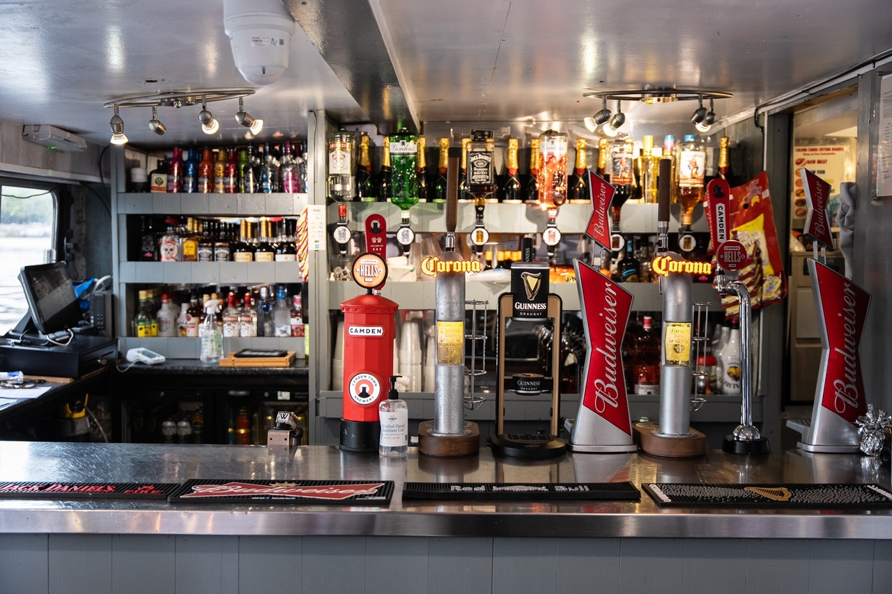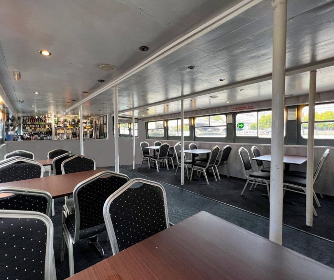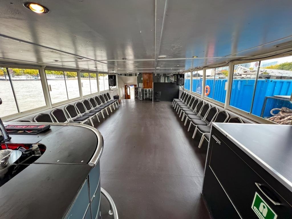 Upon entering the vessel, guests are greeted by an elegant reception area. A small stairwell leads down to the lower saloon, which offers the main bar stocked with popular brands and a seating area. Guests can sit back, relax and enjoy the sights as the vessel glides leisurely along the Thames.