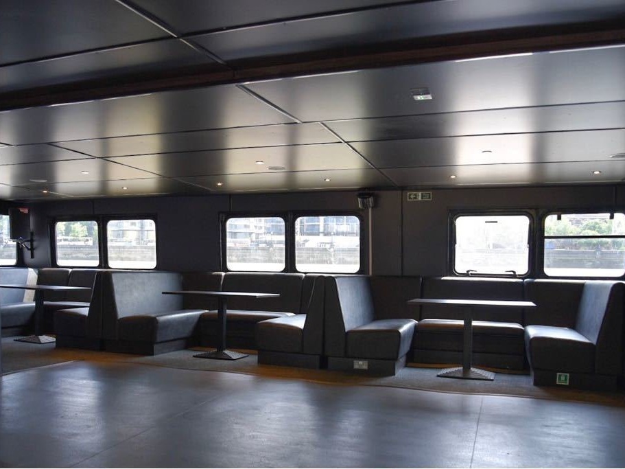 Boarding through the forward doors of the Pearl of London, you will enter the middle deck, a spacious saloon with a large fully stocked bar offering a wide selection of popular brands. The saloon offers seating for up to 64 passengers with ultra-modern black leather seating booths, each capable of accommodating up to eight passengers. These seating booths encircle the spacious dance floor and main DJ booth, which is equipped with state-of-the-art lighting and sound systems.