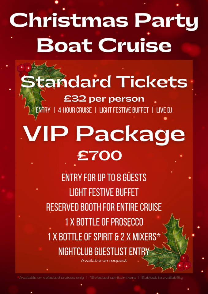 It's all aboard the Christmas Party Boat Cruise for a fun filled night of drinking and dancing on the River Thames!